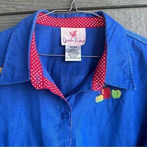 Quacker Factory Womens Med Blue Corduroy Teacher Apples Button Up Shirt School