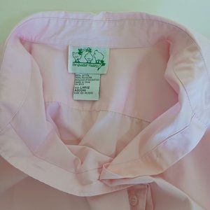 Excellent pre-owned condition. Light pink, collared, button front shirt with embroidered floral design along the front hem. There are also two flowers on the right back hem. The stems are ribbon and the flowers are embroidered in bright colors. Flowers include daisies, tulips, day lilies, iris, and others. Some of the daisies are accented with beads in the center. Rhinestones are sprinkled throughout the design. Double button adjustable cuffs. I have looked over all the flowers and all are in great shape.