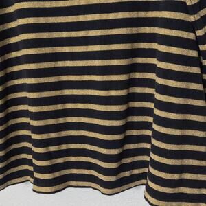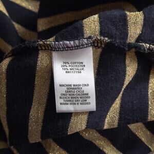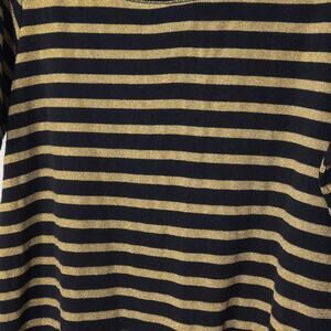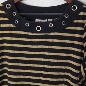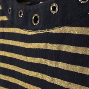 Quacker Factory women’s tee in navy with metallic gold stripes and bold grommet neckline detail. Tagged plus size 1X. This top channels a nautical classic feel with coastal and preppy cues, bringing a resortwear-ready stripe into a comfortable short-sleeve silhouette. The cotton blend has a soft hand and drapes with ease, making it an easy piece to reach for when you want both polish and comfort.