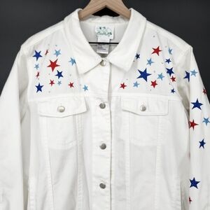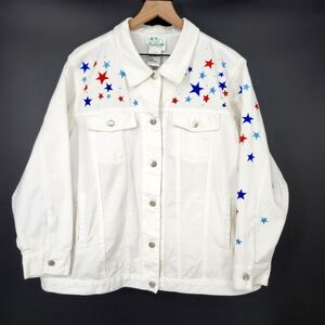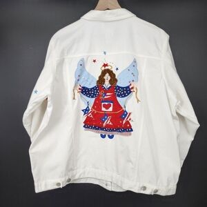 Quacker Factory Womens White Denim Jacket 1X Red Blue Angel Stars Embroidered