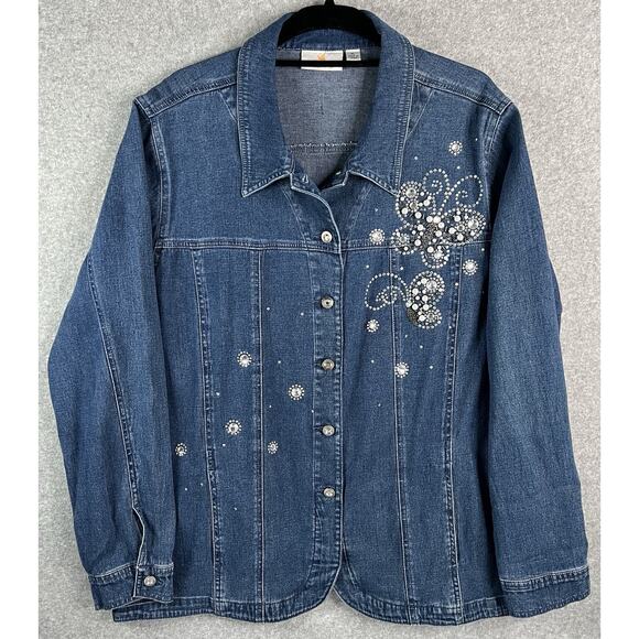 Quacker Factory Womens XL Denim Jacket Rhinestone Pearl Butterfly Embellished
