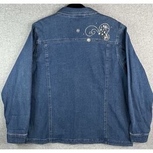 Quacker Factory embellished denim jacket in Women’s XL featuring beautiful rhinestone, pearl, and butterfly accents. Classic button-front jacket style with subtle functional front pockets and stretch denim for comfort.