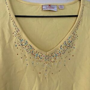 Quacker Factory Rhinestone T Shirt Pre-owned in excellent shape! Size: XL Color: Yellow Material: 100% Cotton Measures approximately 24.5” from shoulder to hem / 24” pit to pit Short sleeves V neck Multicolor rhinestones throughout neckline
