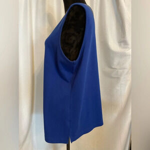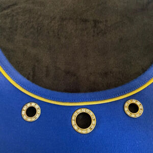 Tank top has three circle cutout rhinestone accented circles around neck with gold trim. Gently worn and in excellent used condition.