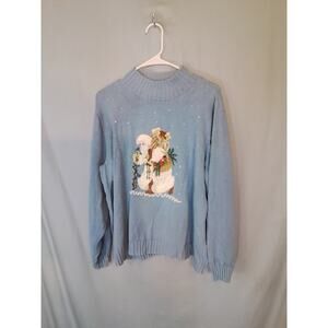 Quacker Factory; blue winter pullover sweater with Christmas theme.