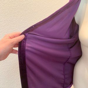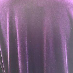 Beautiful comfortable jacket purple velvet with purple sequins at lapel, neckline and cuffs. Size medium. My mannequin is a size M/L for reference. Made in China, polyester and spandex, hand wash. There's a little hook at the bust for closure. Please see measurements for fit. Worn gently, excellent condition.