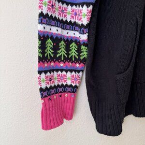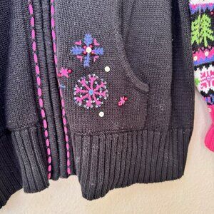 Black sweater with pink purple and green Nordic print on sleeves. Blanket stitch, sequins, snowflakes on pocket. Very pretty sweater.