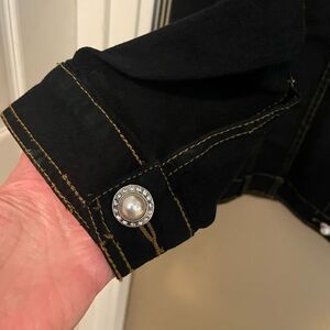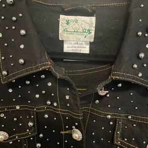 Dark black despite my pictures! Beading and rhinestones all over this button up jean jacket! Excellent overall condition! There are two rhinestones missing out of two buttons. Truly doesn’t show this jacket has so much bling! Beads and rhinestones extend to the back of the jacket also! One of Quacker Factories finest! Women’s size 1X
