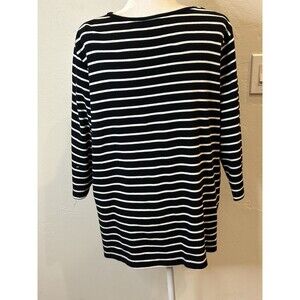 This Quacker Factory top is a must-have for any wardrobe. With a striped pattern, 3/4 sleeves, and a round neckline, it's perfect for any occasion, whether it's a casual day out or a party. The top is made of a comfortable knit fabric, a combination of polyester and cotton, and features studded accents for a touch of elegance.