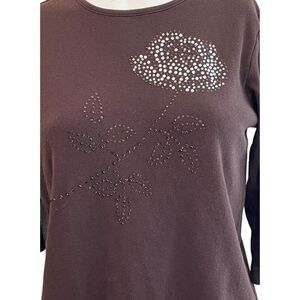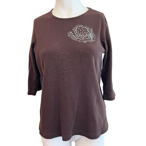 Quacker Factory Womens Small Beaded Rose Studded Blouse Brown Top Flower