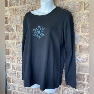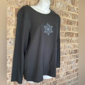 Quacker Factory new with tags top with snowflake. Armpit to armpit measures 19”. Shoulder to hemline 26”.