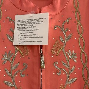 Gold and silver embroidery stitching down the front and on the sleeves. Front pockets. Could be worn as a blouse or over a tank as a jacket