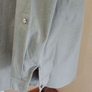 This pretty top has some surprises. Button up front with sparkly buttons, even one on the sleeves that will shorten the sleeve with a tab. The front is embellished with sparkly diamonds in rhinestone, only one stone missing, see photo. Size M, there is a little stretch, measures 44 at chest, 48 at slightly curved bottom hem. 28 long from shoulder to hem. Sleeves 23 long. This will be your go-to.