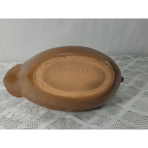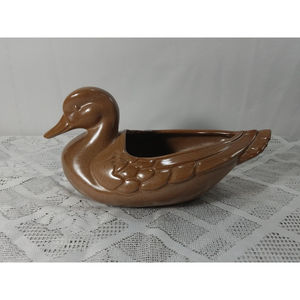 This charming Frankoma Mallard Duck Planter adds a delightful touch to rustic farmhouse decor. Standing around 5 inches tall and measuring 9 inches in length, it features a sturdy body with an opening of 3.5 inches and a width of 6 inches, making it perfect for small plants or as a decorative piece. In excellent condition with no cracks, chips, or flea bites, this planter is both functional and a lovely conversation starter for any home.