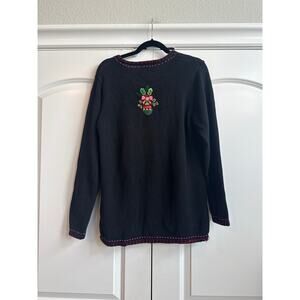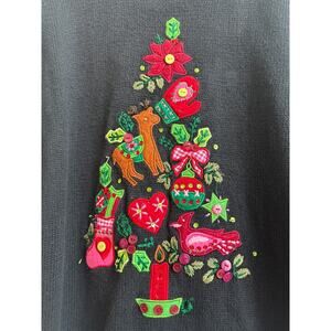 Quaker Factory Black Sweater with Embroidered Christmas Tree Novelty Detail