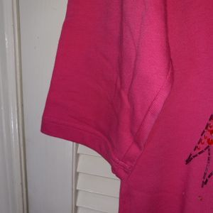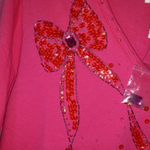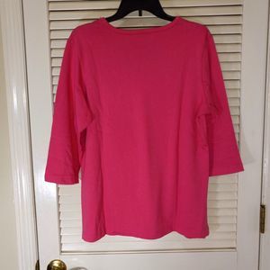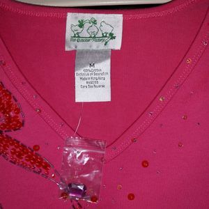 Quaker Factory Top Medium Pink Beaded 3/4 Sleeves Ribbed Bow Holiday Hong Kong