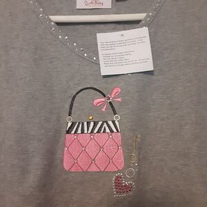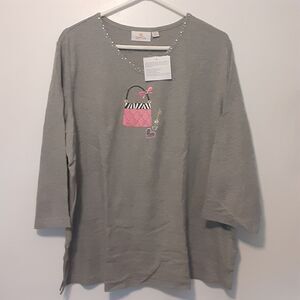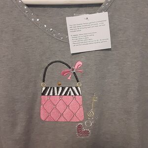 This Quaker Factory women's T-shirt is perfect for any holiday party or event. The gray cotton material makes it comfortable to wear and easy to care for, while the rhinestone and embroidered accents add a touch of sparkle to the shirt. The 3/4 sleeve and V-neckline make it a versatile piece that can be dressed up or down.