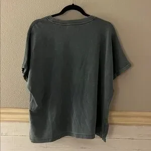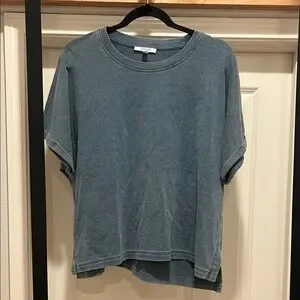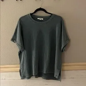 High-quality, thick but soft, basic tee. The sleeves are folded and pinned, and will not look sloppy or unroll. The shirt is very soft and great for casual every day wear. The color is a bluish, gray, almost like a faded denim.