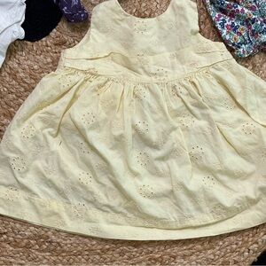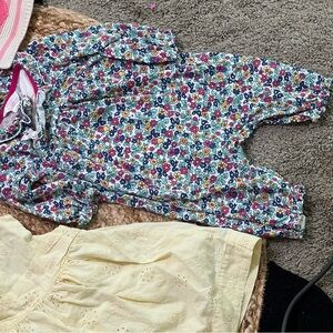 Charming Janie & jack CHAPS BURTS BEES infant girl clothing set. Includes 3/6 months pink striped knit bear & tulip cardigan. Gap 3/6 months yellow floral cotton dress. Janie & jack 6/12 months navy checkered plaid romper piece, and floral details. Chaps 3 months floral colorful footie. Burt’s bees 0/3 months purple footie with pink lace detail. Blue label Ralph Lauren knit hat with pink bow details. Majority pieces are 100% cotton offering comfort timeless preppy style for babygirl.