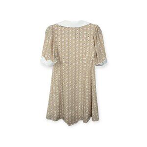 vintage french dress, ditsy floral dress, beige dress women, white collared dress, button closure dress, short sleeve dress, cuffed sleeve dress, retro style dress, parisian chic dress, lightweight summer dress, vintage inspired fashion, timeless elegant dress, beige and white dress