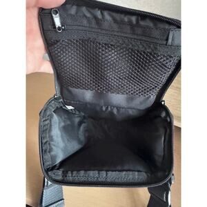 This listing is for a Quantaray small camera bag in black, featuring a sturdy shoulder strap and compact design. The dimensions are approximately 7 inches wide (at the widest point), 3 inches deep, and 8 inches tall. This bag shows visible signs of wear, which are clearly shown in the included photos. It has multiple compartments, a zippered front pocket, an interior mesh organizer, and padded protection for your gear. The zippers and hardware show some paint chipping and wear, but they function well. Perfect for carrying compact cameras, accessories, or as a general-purpose small gear bag. Please review all photos for condition details before purchasing.