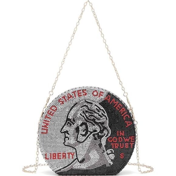 - Rhinestone-beaded design with a unique dollar coin motif.