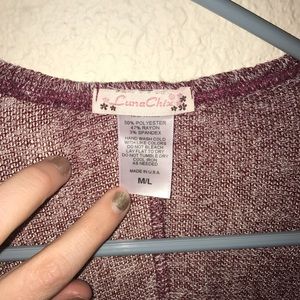 The color is a light maroon color! Very lightweight quarter sleeve cardigan. Very lightly worn and in great condition. Size is M/ L and could fit either honestly.