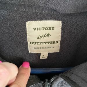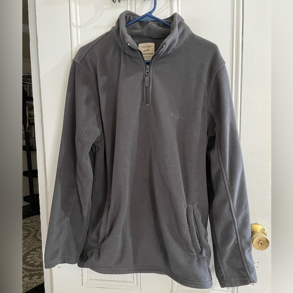 Gray quarter zip sweater from food store. Worn in new condition, one bleach stain, otherwise okay.
