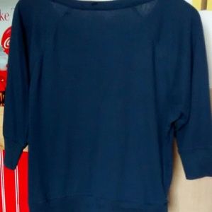 Navy blue, T-shirt material. Cuffs at the waist and sleeves. Swoop neck with possible off shoulder look. Floral design on the front.
