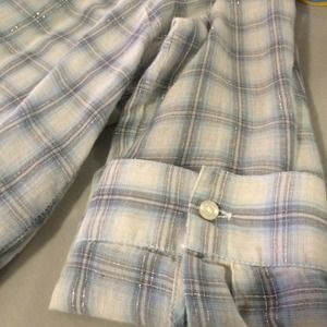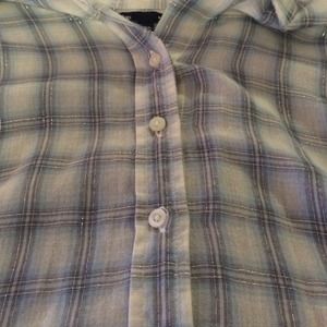 Plaid pattern light blue, gray, and silver button up shirt from Gap. Only worn 2 times. Fits shorter girls (under 5'3'', like a tunic)