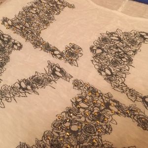 Beautiful cream color, lightweight, quarter sleeve crop top with charcoal grey LOVE and gold rhinestones!