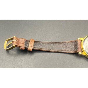 Leather strap shows signs of wear. Case diameter approx. 1 inches.