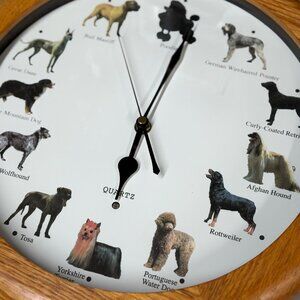 dog breed wall clock, barking chime clock, 13-inch quartz clock, dog lover gift, wood frame wall clock, novelty dog clock, home décor clock, battery-operated wall clock, fun chime clock, collectible dog clock
