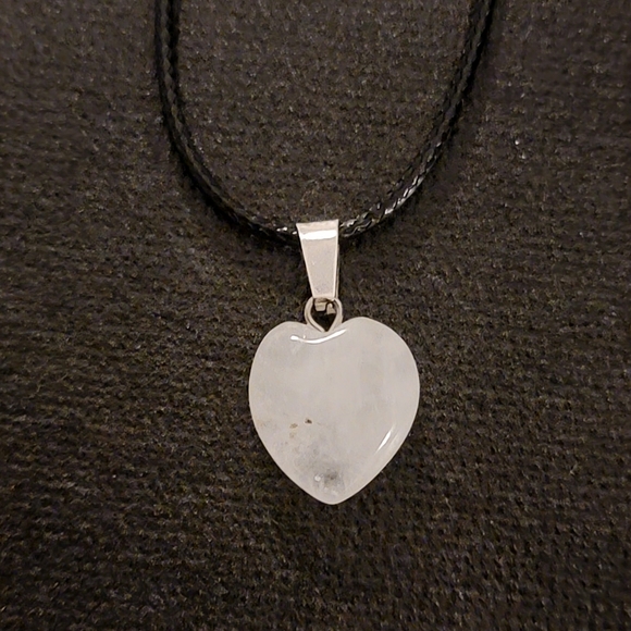 Quartz chakra heart pendant on 18" leather rope necklace with 2" extension and lobster claw clapse. The quartz chakra healing stone helps clear and open the mind to higher potential. Brings stability, clarity and provides protection from negative energy. It attracts love and prosperity, concentration and memory.