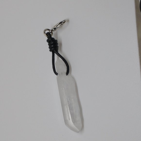 Quartz Crystal Pendant features a long textured quartz crystal with a black leather cord wrapped bail, and a lobster clasp. Attach this transparent charm to a chain, ribbon, or cord for a touch of natural beauty.