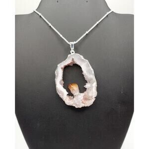 Make a bold statement with this stunning necklace featuring a natural white quartz geode accented by a genuine citrine crystal nestled inside. The large pendant measures approximately 2 inches long, 1.5 inches wide, and 0.5 inches thick, creating a striking and unique centerpiece. The pendant is framed in a silver alloy setting, which also secures the citrine in place.