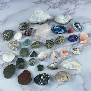 Set of 34 natural stones. One pyrite can be used as a pendant for necklace or bracelet.