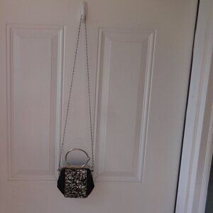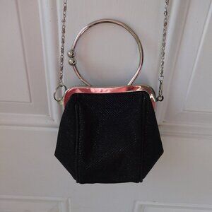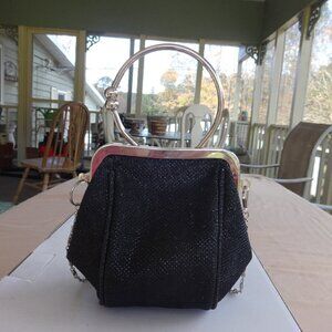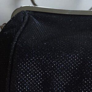 silver tone hardware and chain strap ( strap is removable ), black fabric is firm and has a glitter look