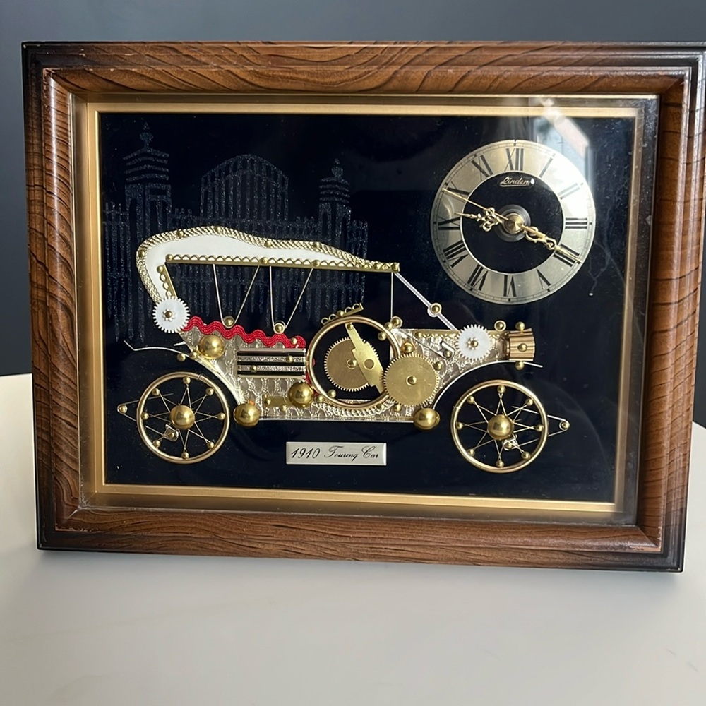 Vintage aristocratic 1910 Touring Car Framed Quartz clock from Linden. Battery operated. Can sit on table top or hang on the wall. 10”x8” in size. This was a wedding gift given to me and my husband when we got married in 1988.
