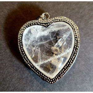 Like new! Beautiful large heart pendant made from polished quartz crystal. Rhodium plated frame and floral details. Nice weight to it. Beautiful piece. Comes with new black velvet sachet bag.