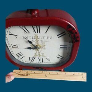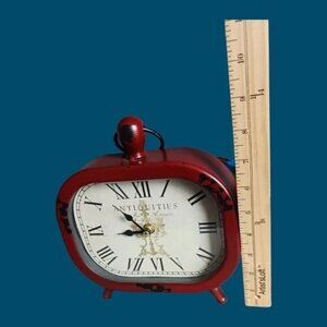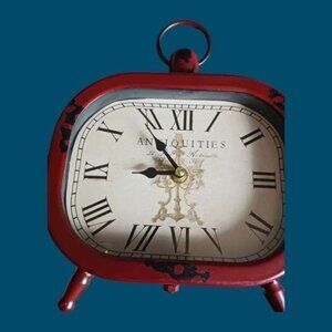 Quartz rustic analog metal tabletop copper color the metal clock is fitted with a silent quartz movement distressed and chipped paint design squared shaped with distressed solid pattern in excellent condition without box from smoke and pet free home.0473