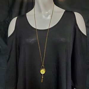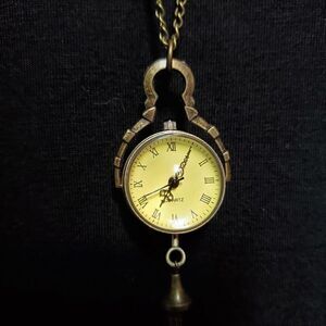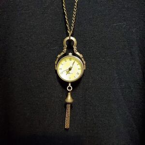 Steampunk style gold colored necklace with a Quartz watch pendant with a tassel dangling from it.