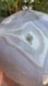 Another unique piece of flower agate moon carving. This one in various shades of moody blue with banding outlining a center quartz with druzy pocket. Pink flowers tops the moon like a princess tiara. Please reference pictures and video for more details. Measurements are approximate. [FAMOON005]