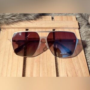 Quay Australia Backstage Pass polarized square aviator sunglasses. These stylish sunglasses feature a modern square aviator design with polarized lenses for reduced glare and enhanced clarity. They are in new condition with the polarized sticker still attached to the lens.