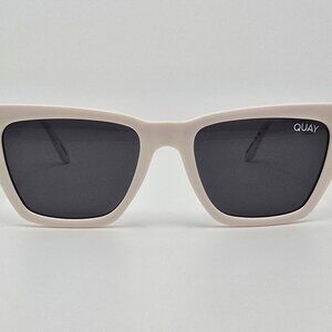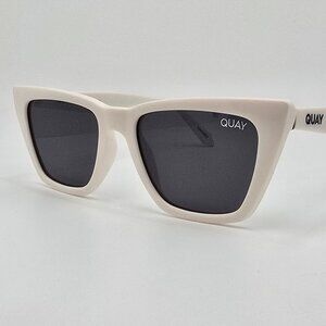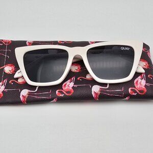This listing is for authentic Quay Australia Call The Shots White Frame Polarized Smoke Grey Lens Cat Eye Sunglasses w/ Case 54-19-150. Sunglasses are in good pre-owned condition, (see photos). Listed price is reflective of item condition. Size: 54-19-150. Made in China. Off brand 3rd party flamingo soft case included in listing. Please see pictures to make your complete condition assessment.