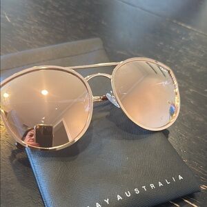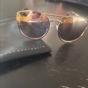 These Quay Australia sunglasses feature a sleek gold aviator-style frame with a prominent double bridge, offering a chic and modern look. The large, mirrored lenses provide excellent eye coverage and a stylish reflective finish. Perfect for adding a touch of elegance to any outfit.
