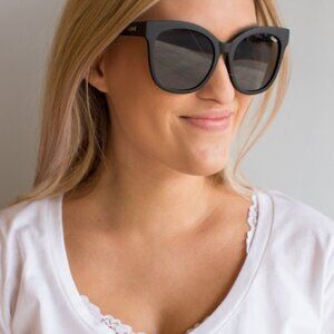 The My Way sunglasses from Quay Australia are the ultimate glam sunnies with an oversized cat-eye style. Matte black plastic rim alongside black lenses make for a sleek look. Polycarbonate lens. Steel hinges. 100% UV protection.