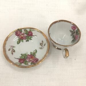 Queen Anne Antique Floral Red Rose Tea Cup & Saucer Set Gold Trimmed Corners