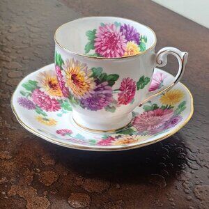 High-quality fine bone china tea cup and saucer set by Queen Anne with a vibrant floral design. Manufactured in England under the "Autumn Glory" pattern.