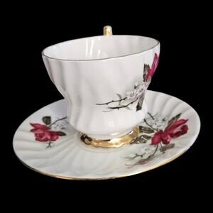 Beautiful vintage Queen Anne bone china teacup and saucer made in England, featuring deep red/pink roses, green leaves, and elegant gold trim. The cup has a swirl/fluted shape with matching saucer design. A lovely collectible display piece or perfect for teatime or gift giving.